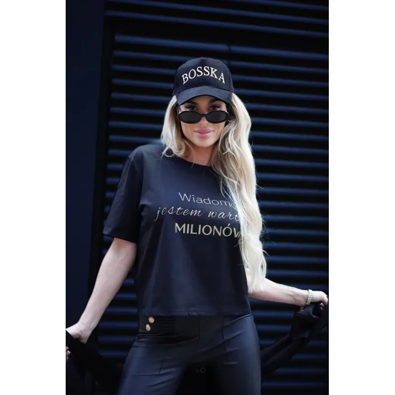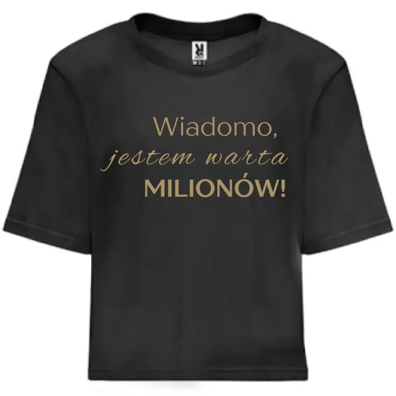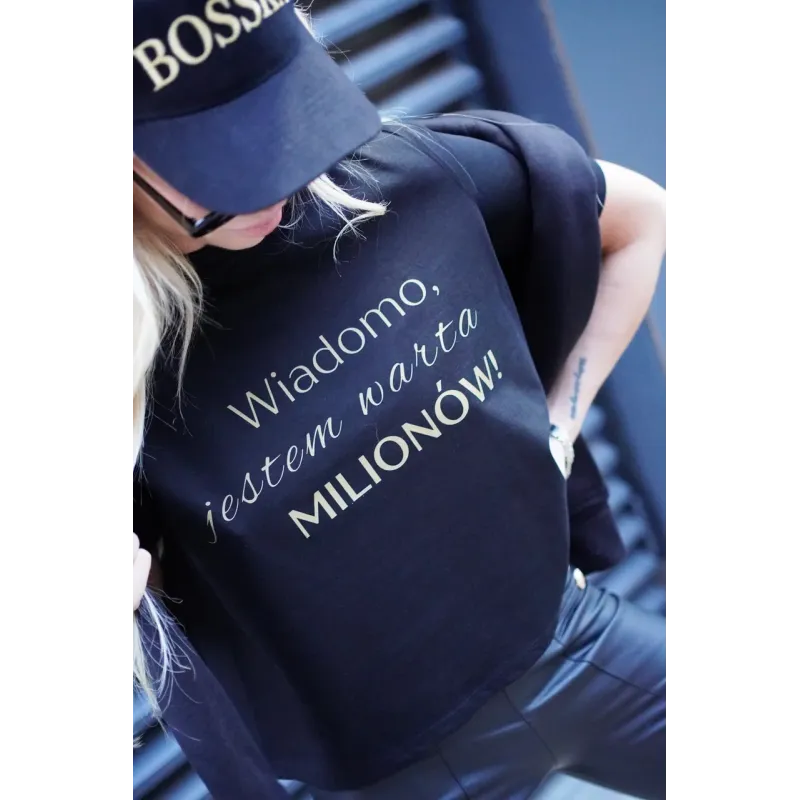 Koszulka oversize "Wiadomo, jestem warta MILIONÓW!"- czarna ze złotym napisem