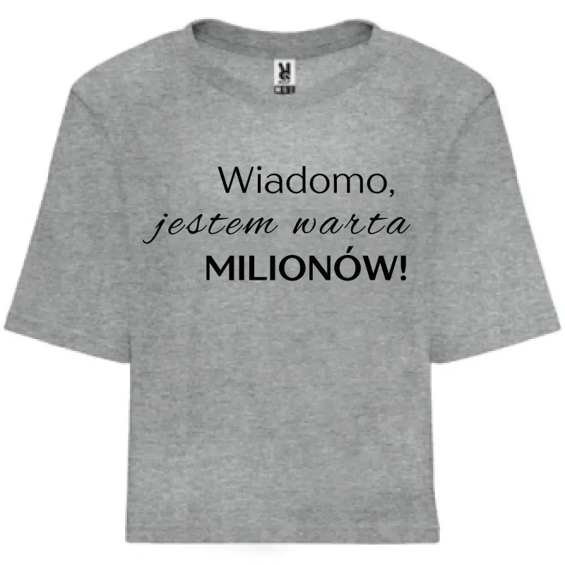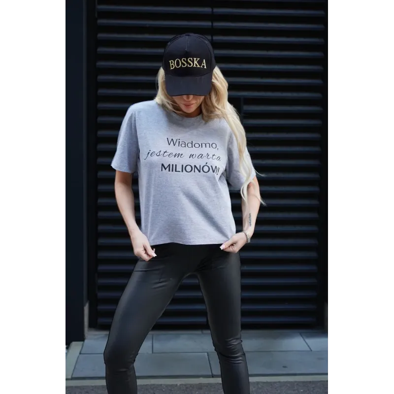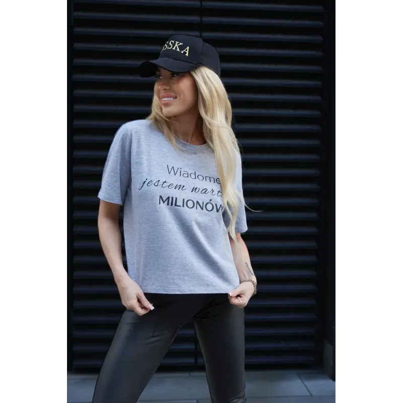 Koszulka oversize "Wiadomo, jestem warta MILIONÓW" - popielata z czarnym napisem