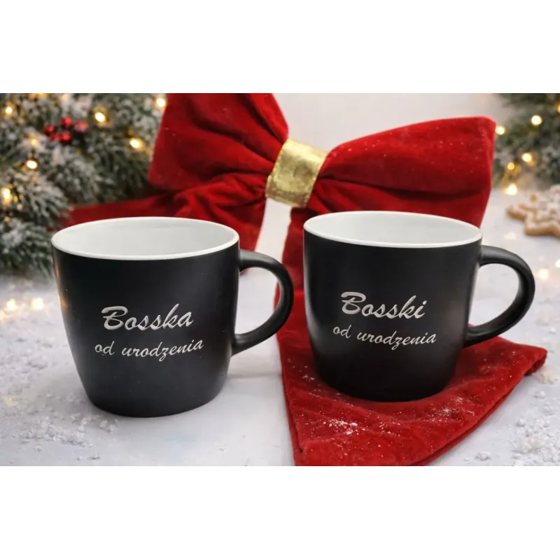 Zestaw dwóch porcelanowych kubków z grawerem: „Bosska od urodzenia” oraz „Bosski od urodzenia” to prosty i stylowy dodatek do codziennej kawy lub herbaty.