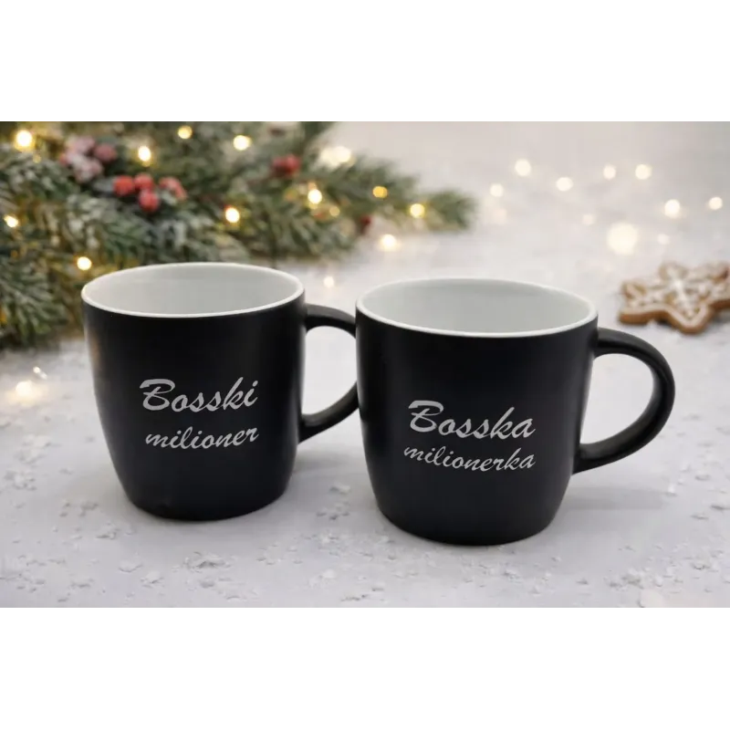 Zestaw dwóch porcelanowych kubków z grawerem „Bosska Milionerka” i „Bosski Milioner” to przyjemny dodatek do codziennej kawy lub herbaty oraz subtelna afirmacja pieniędzy i obfitości na co dzień.